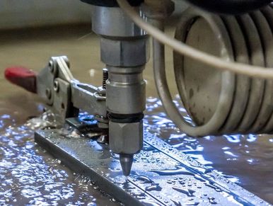 Waterjet quickly cut metal and plastic parts from sheet materials using a high-pressure stream of water and abrasive.